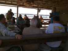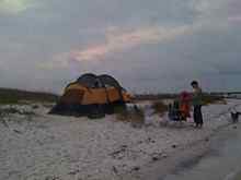 After exploring the ruins, we made great plans to circumnavigate the Kingdom of Sand Island. On the whole East shore was a sand flat with about 3- 4 feet of water out a good 150 yards. As we slowly drifted across this flat, still marveling at the water clarity, my wife spied some movement about 20 feet off to starboard. At first I labeled it a dolphin, but both Karen and my son Matthew quickly corrected me. There in plain view of all 5 of us, and the dog too, was a 4 foot Blacktip Shark. He swam there, parallel to our course, for 2 or 3 minutes before darting of for parts unknown. Several more passes showed no more of the scary finned creatures, but we did see MANY stingrays, some of them quite large (personally these I find more scary than a shark). A short sail out of the bay and into the Gulf just to say we did, and it was back to camp for a great meal of sausage and all the fixins prepared by Pat Johnson. A few beers and some laughs and day 1 was a wrap.