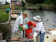 When we got settled there were more boats than I had expected; ten or twelve. When I first wrote about this event I said that one could expect high winds, no winds, storms, contrary winds, and down wind runs. Apparently the OBX decided that, after 2009's perfect weather with a following wind in every direction we wished to sail, it would show me what it could do. A tropical depression had formed in the Caribbean. Where it would go and how it could affect weather at the OBX was anyone's guess. Guessing is what the weather people were doing as was illustrated by the fact that they could not even predict things half an hour out accurately all week. There were a bunch of guys from the TSCA Delaware chapter there in smaller boats. They were going to day sail out of Cedar Island and then day sail out of Harkers Island to perhaps meet up with us in the bight if the weather moderated. They never made it to the bight. After the event I emailed Mike Wick who was with them and he said they could never have made it in the weather we went out in. He said something about us being another breed entirely. This was his polite way of saying the crap does not fall far from the crazy bat, I think. In the end we had most of the boats do the smart thing and stay in port. With only six boats starting, we set out as intrepid a bunch of blokes that ever shoved off.