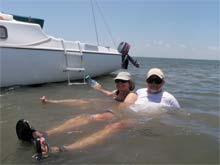The 2011 Texas 200 had about 50 people and 36 boats participating. The weather was predicted to be perfect - nice and sunny all week long and winds 10-15 from south/southeast. The boats varied from canoes with sails to 24' fiberglass sloops. The vast majority were on the smaller side and homemade. The route was shifted down the coast a little and we started at Port Isabel/Padre Island and ended at Seadrift with five camping days in transit. We left PI early Monday and it was wonderful to see sails spread out across the horizon behind and ahead of us. Several times we were visited by dolphins who seemed curious about our quiet mode of transportation. As we made our way up the Intracoastal Waterway through the Laguna Madre, my wife noticed water in the bottom of the cabin. Because of all the additional gear we were hauling, the waterline of the boat was lowered such that the hole where the keel cranking cable came into the cabin was underwater when we rolled in the swells coming from our stern. The first night's scheduled camp was along the Port Mansfield channel at the jetties, so we decided to put in at the Port Mansfield harbor for repairs. I was able to fix the problem using a beer cozy, epoxy and a stick. On day two we sailed to a camping spot along the land cut. We were towing one of our kayaks behind our boat and although I had done this a few times before, the following wind kept shoving it around and it flipped and sank quickly. The rope broke and we had to chase it up onto the shallows. We finally got it aboard and the only place to stow it was on top of the boat, over one side of the cabin which really crimped our sail handling ability. The wind really started to blow that afternoon after we got there and tents were being blown down. So much for the wind predictions. Everybody was hunkered down. People were looking for shade wherever they could find it because the heat was setting records that day. My wife, son and I pretty much hid in our boat's cabin until late that afternoon when the wind dropped and everyone began gathering together visiting. The next day the wind really blew and pushed us up the Intracoastal and past Baffin to our next campsite along the backside of Padre Island. I was impressed by the sailing skills of the folks in the small wooden boats. After getting off the water I was told that the winds were measured at Baffin Bay at that time to be gusting to 33mph. We ran aground a couple of time as we left the Intracoastal and tried to make our way to the campsite, but we finally found better water and slowly motored in. I was envious of how the little flat bottomed wooden boats could fly across the 12" to 18" shallows. Our campsite was beautiful with a sand beach and nice clear water. There were a lot fewer boats camping at this site. I saw some boats head on down the canal and some of the others had not shown up and we wondered what had become of them. The wind had scattered us and some boats were having problems. The next day we were scheduled to cross Corpus Christi Bay. After listening to the weather forecasts for the next day and talking to some other folks we decided we were going to take out the next day. A couple of guys who were using Hobie Catamarans were also quitting and they could give me a ride to our truck. The Hobie guys said they were concerned that the strong following wind was going to blow them end over end. Quitting was a hard decision, but we were on a tight schedule to leave for Washington State immediately after this trip and taking care of a boat stuck on an oyster reef or worse sunk wasn't in our plans.