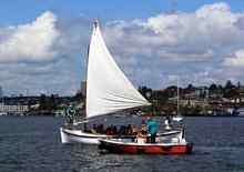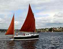 The Phil Bolger-designed TOMBOY, built in 1989, sails just off the CWB floats at the south end of Lake Union. |