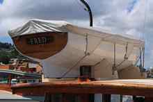 SANPRAM is a 12-foot long pedal boat, designed by Philip Thiel of "Escargot" fame. Although we couldn't see it since the boat was afloat, SANPRAM has a beautifully designed two-bladed wooden propellor, that, we are assured, can drive the little boat at 4 knots while pedaling at 75 rpm. Thiel's website, is a good place to check out making such a propellor in more detail.