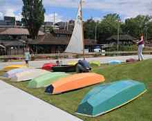 CWB maintains an active fleet of El Toro prams as well as the molds for building these popular little sailing craft. Here they are drawn up on the grass, with one being rigged for visitors to enjoy.