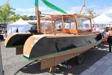 The Art Shell-designed and professionally-built Crab Claw catamaran was an eye-catching boat placed near the entry to the show. 21 feet long with an 8 foot-four inch beam and drawing just one foot, this boat was designed for use on Vermont's Lake Champlain and is easily driven by a small outboard. The nicely enclosed cockpit appears quite spacious.