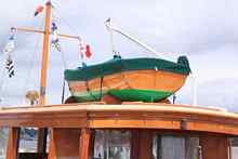 This was the first year the trim little lapstrake dinghy atop the house on the Lake Union Dreamboat ZELLA C caught my eye. We can hope her owners visit the Festival again next year and permit her to get wet.