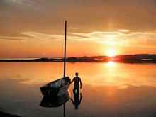 I then found myself freely sailing through the air since the boat came to a sudden and complete stop with a heartstopping crunch. I was pitched into the forward section of the boat head first and the mainsheet got wrapped around my leg. The boat started to go over on its side and Jason and I scrambled for the windward rail. I went grabbing for the mainsheet and dumped the 105 square feet of lug power, and Zinea promptly went over onto the starboard side where Jason was sitting. The gunwale dipped and water starting coming through the inwale. I had a vision of Spanish castaways swimming at night to a deserted island with the wreck of a boat- my boat- left to die on the rocks as we pushed flotsam ahead of us. All I could think was: I hope we can get a fire started. Fortunately, my vision was not to pass, and the boat came back upright as we flung ourselves over the daggerboard trunk. I directed Jason to drop the sail and he dutifully uncleated the halyard. An advantage of the balanced lug is that it strikes in but a moment, and the yard came down with a solid whack on my shoulder from fifteen feet above.