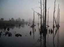 The lifting fog reveals an eery labyrinth of dead rees and stumps in Pamlico Sound. |