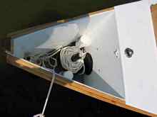 Once right side up, it was time to begin fitting her out with the deck, gunwales, rubrails and windows. I decided to (mostly) stick with the plans for all the various details. I found that I was at a point where it was time to paint. All along I had been mulling color schemes, and it was time for the final, difficult, decision. A trip to my True Value, and I had a gallon of Benjamin Moore Alkyd all purpose primer, a gallon of red oil based porch and floor enamel for the hull, and a quart of very light blue for the topsides. I wanted some bright wood, so the rubrails, gunwales, and slot top rails were masked off, and the paints rolled and tipped off. The masking was removed, and all brightwork received several coats of spar varnish.