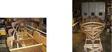 Once the frames, stringers and other various other pre-fabricated pieces were permanently in place on the bottom panel, it was time to contemplate planking. The plans and 'suggested' methodology was to plank her as she sat upright on the strongback. Hmmmm... as there would be a reasonable amount of fairing on the stringers to match the laps of the plank, including the cleats on the outboard of the bottom panel, rolling her over began to make a whole lot of sense, provided not a whole lot of stress was placed locally on any one spot of the framework. This would also entail an additional temporary structure on which to sit the framework as the planking proceeded. A decision well made.