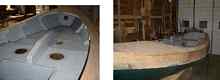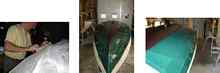 So board sand it was to the bare hull, 3 coats of high build undercoat, working 120 grit to 220 and then three layers of a nice dark " emerald" green for the finish, wet sanded between coats. The lighting definitely played tricks with the 'shade' of green, all to the good, however. The sheer plank would wait until she was flipped over again which was done in the same fashion as the last flip... Time for the deck and final bits and pieces of coaming and trim. It was now close to mid June and things were moving reasonably well outside of it being the 'boater call' time of year where attention had to be paid to one's pocket book - "can you fix this and get that ready as we're off cruising tomorrow.." etc. etc Not to be deterred, however, it was time to get things completed so as to enjoy some of the end days of autumn hopefully sailing before winter set in. Once the painting was in order for the bottom side she was flipped once again to "finish" her off. In all my years of working on boats, it never fails to underestimate the time needed to " add the final touches", particularly when a sub deck is part of the structure compared to an open bilge arrangement which precludes the tedious "picking up" of the shape of that sub deck. Buckle down and get it done and we were on to the smaller upper deck which could easily be overhung and trimmed to shape without too much fuss.
