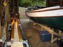 Planking done, it was time to focus on the what kind of finish was appropriate (while it was still upside-down) for the main hull as well as the more noticeable 'garboard' plank. Two ways to go here which was basically dictated by the 'existing' finished plank surface; get the undercoat on and topcoat 'er with basic marine enamel and be done with it OR fair out the surface with high build undercoat and a reasonably long board sander and spend the extra bucks on a good polyurethane that would shrink tight and shine in the light. Having come through a background of spending hours board sanding in a professional yard as well as on my own 40 ft cold-moulded creation, I went for the 'finer finish' end of things.