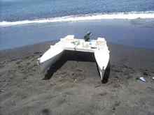 FIXING IT: Had a hole in the bottom of boat one. Evidently some rocks under the keel, hidden by sand; too many kids jumping on it, over too long a period of time. Cut out the bottom where it had the holes - see cutter above. Sanded both sides extensively - see same tool above.