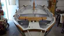 The white oak skegs, soft maple stringers and our sloppy epoxy no doubt contributed to the excess weight. We estimate that Peggi J weighs hull weighs close to 140 lb. This weight does not include the sail or spars nor the daggerboard and rudder-tiller assembly.