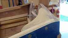 My bigga mistaka was (ever watch the British Comedy " Allo Allo") I was convinced that the Sherpa needed a leeboard instead of a daggerboard in order to navigate the often shallow lakes of West Texas. So in the building process I left out the daggerboard slot and chaise. I sized and shaped a leeboard using two half-inch thick layers of meranti plywood.