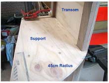 The purpose of the radius, instead of a square end on the transom, is to allow the water a smoother exit from beneath the hull, thereby reducing the drag on the aft of the boat. This is where design philosophy meets reality. The builder ends up paying the price of a difficult process.