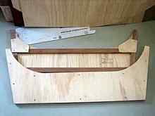 The next photos will outline the task of applying the base to the Aft Module. This is probably the most difficult part of the whole assembly, as Michael will attest to. It requires that the plywood be bent around a 45cm (18") radius at the transom. This necessitates the plywood be kerfed in order to bend this sharply. The drawings specify a 3mm (1/8 ") deep v-groove every 2 to 3 centimeters. In fact, Michael had to make them every 1-1/2 cm, and even then the task was challenging.