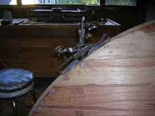 The planking is now complete. The final bits of the hull are the keel plank and the outer stems. The landings for these outer pieces need to be checked for fairness. In the case of the stems, the Stanley 113 is the ultimate tool. The adjustable bottom of this compass plane effortlessly fairs off any irregularities.