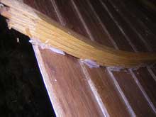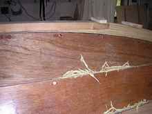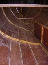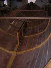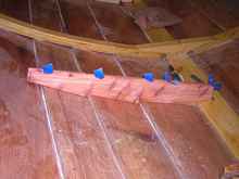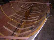 All the floors have limbers cut like the ribs. When they are all laid out and temporarily fastened with screws to the planking (at the laps to avoid going through the finished hull), you can test the fairness by placing a stiff batten atop them to look for high spots. Fine tune them, seal them and glue them in. The edges are cut back square 1" inboard of the third plank edge, where there will be a filler strip below the floorboard, riding on the lap seam.
