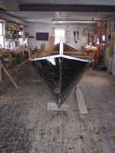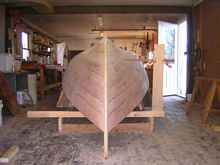 The pointer rests on a shelf and can be moved back and forth as the hull widens. The frame slides on the supports and can move in and out freely as well. There is a ball point pen in the end of the pointer. It worked out pretty well (and was fast), but your eye is the final arbiter of the fairness. Now the hull is ready to seal.
