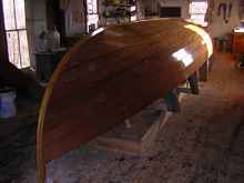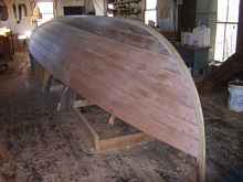 When everything is as fair as you want it, the time has come to seal. A good finish is time consuming. I pay great attention to the finish above the water line, but below it I am happy to have it a little rougher. I was not sure exactly where the load water line was on this old plan and selected the probable line, about 18" below the sheer amidship, based on photos of old boats in use. I scribed it using a jig that slides on the supports for the molds. These supports were leveled at the beginning of the set up and were more true to the hull than the floor of my shop.