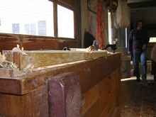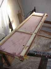 I would guess it weighed 400 lbs. With the molds out you can now get at the glue that got under the molds . This is tedious work. The WEST people say it is safe to heat it up with a heat gun and scrape it off: chisels and scrapers help.