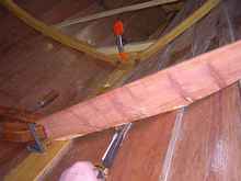 Now the stems. I laminated these up on the lofting floor over a year ago, and by the time I got around to using them they had sprung a bit. I probably could have fit them, but decided it would take less time to laminate replacements right on the hull. The laminates were bent and pre-fastened to the stem with sheet rock screws and plywood pads.