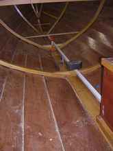 A batten along the centerline helps determine the height of the central flat area; note the spacer block on the 7th rib to make the floor wider at this frame.