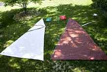 Joe had put a tarp over the boat when he put it in the garage in 1975. Unfortunately, the garage roof had leaked, and over time, so had the tarp. The boat had about eight inches of brackish water in it, and my first thought was “dry rot”! The trailer tires were also flat, but miraculously took air after 45 years, and didn’t leak. I gathered up the foils, spars, and sails, hitched her up and drove her to a steep-sloped parking lot to get the water out. Joe told me that he didn’t believe in bailers and transom drains, so I had to bail her out for over 30 minutes with a coffee can and a sponge.