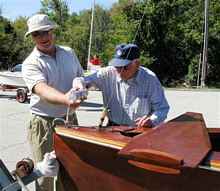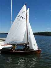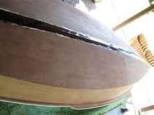 I towed the boat to the shop in mid-September and began the battle of removing layers of 50-year-old varnish. The vinyl varnish that saved the boat from dry rot now became my enemy. The vinyl base would not respond to stripper, and scraping knives had a tough time getting a bite. Sandpaper clogged up quickly with melted residue. 40 hours of scraping and sanding finally yielded a bare hull, spars, and foils ready for refinishing. As a preventative, I overlaid the keel seam with a four-inch wide strip of fiberglass mat and resin. The first swipe of new varnish caused the beautiful mahogany grain to jump out, and I knew all the work was going to be worth it. After four coats, some new flotation, and some updated hardware, she was gleaming and ready to launch.