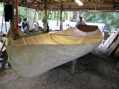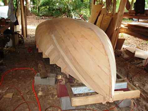 Here is a lesson in "cold molding" or better known as the "pulling out a million staples method of boat building". When Howard decided to build "Tricia Marie" the 20 foot melonseed he wanted to try something different so he cold molded her. When Mike Wick decided to build his melon "Moggie" he took the perfectly good hull I gave him and cold molded his boat on top of it. What you end up with is a super strong molded plywood boat. You can see from Tricia Marie that he set up the molds, put in a lot of stringers, cut up a bunch of 1/4 inch plywood strips and stapled them at an angle to the stringers. Next he took more plywood strips, glued and stapled them to the first layer using Titebond III waterproof glue. You can't leave the staples in the first layer or you can't get the finished hull off the mold so you have to pull them as you go. You can't pull them early cause that's what's holding the first strips to the mold. These plywood strips need to fit nice and snug to each other or you get gaps that weaken the hull. After the glue dries for the second layer you can pull all the staples at once, this is where you have a beer and staple party. Then you put on the third layer going another direction with more glue and a million more staples, (somewhere along the line he went out and bought an electric stapler). When that 's all dry you sand and fill and sand and fill and glass the whole thing. What a pain in the ass all this is, it takes a long time, lots of fitting together and the staples never end. When I built this same hull for my Helen Marie I used the same strongback, the same molds, added a few more stringers and had a strip planked hull. All done and glassed by myself in a week and no staples to pull. I'm glad he did one this way so we could see how it's done but I'm not sure it's any better than strip building, if you need more strength just add more glass.