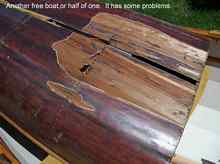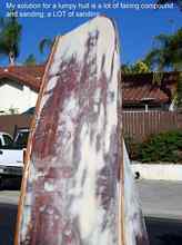 I've never built a boat; I seem to be attracted to bringing old junkers back to life. My latest is an odd one. It's a home built, of unknown and mysterious design: bow of a Adirondack Guideboat, middle of a freight canoe, stern of a Whitehall skiff. A very nice shape. Someone appears to have done a respectable - not expert - job of strip planking it like a canoe, and then smeared polyester resin all over it like paint. He must have been disappointed when it cured as rough as a corncob. OK, not that bad, but you get the idea. At least it sands off pretty easily. Oh, and it is a take- apart boat in two halves. By the time I'm done, I will probably be wishing that I'd built one from scratch instead.