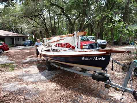 Here is Tricia Marie leaving the shop. Howard's taking her away to a consignment shop. Trish is the most beautiful boat ever built, sails great, comfortable, mahogany trim all over, built in electric motor. Absolutely perfect. The problem is that we're great builders but terrible salesmen - been thinking about advertising but just never got around to it. Someone willl end with a truly fabulous boat for a bargain price. Helen didn't want him to ever sell this one but we need the space.