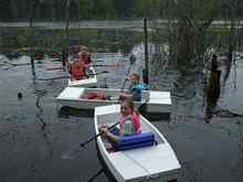 Saturday memorial day weekend we launched two more square mice Yoshi Hawk (my nephews couldn't decide on just one name for their boat, and lightning. The day was warm and the kids all managed to fall in at one point or another. Frost's ice pond Newbury, MA got fully explored. Yoshi Hawk's home port is Lake Placid, NY and Lightning lives in Lebanon, ME. Seagull was also there... In the first picture are all four mice, Lightning with Captain Nick, and Yoshi Hawk with Captain Noah and Captain Levi. Yoshi Hawk is also in the picture with Noah and the water lilly. Lightning has Captain Nick and his blue life jacket in it. Lightning was built with sureply using tape and glue, Gorilla glue to tack it together and then MAS epoxy and glass tape from duckworks to assemble it in 6 hrs. The drain plugs in each air box are also from duckworks also.