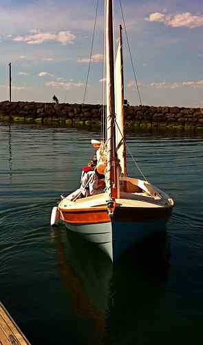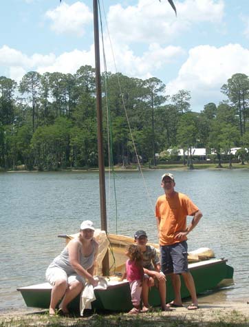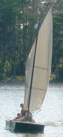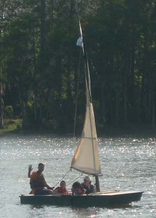 On Saturday April 23rd my wife Amanda, my son Jacob, and I took our PDGoose, No Mas, out for her first sail. All week long the winds been blowing like crazy so naturally when I got up that morning and there's was no wind. But that didn't stop us. We tied the first reef in the sail before we left the house, after all my wife Amanda and I had never sailed before. We headed the four blocks uptown to Lake Alice to try her out. As we drove by the Lake Alice Park we couldn't help but notice the 250 motorcycles or so at a biker rally. "Great," I said to Amanda, "We'll have an audience." We launched without incident and paddled out to the middle of the lake. At first all we had were ghosts of winds past. Finally, I started to get the whole steering thing down and we caught a few gusts and sailed back and forth across the lake.