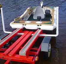 - Water edge launch with dry axles, boat rides up front rails on to trailer.