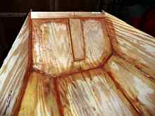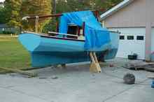 Boat - finished glass on inside, flipped over, rudder stock and rudder cut out and laminate and mast laminated.
