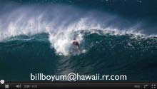 By the way, this clip will show you where the Blue Sway sequences were shot. It's a place in Tahiti called Teahupoo (pronounced Chao-poo). When the Blue Sway stuff was shot the reef wasn't getting the same kind of massive pump that is in the Laird Hamilton clip, but it does illustrate the proximity of the reef to the breaking wave that is coming out of wild and deep Pacific Ocean swells. A dangerous spot when it's huge, as I'm sure you can imagine. I'd be watching from the safety of the nearby channel. That wave is just too damn scary to consider... even when I could surf well. Maybe another life. Video One and Two. This still shot gives you an idea as to how much water is being pushed onto the reef. I've heard it described as the entire Pacific Ocean and that seems appropriate. The white patch is the shallow part of the reef being exposed as the swell sucks all the water off the edge of the island as it pitches up. Less than fifty feet out from the wave face, the water drops to something like 1000 feet deep.