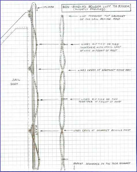 I've had this diagram on my website for some time, but I'm not certain everyone is aware of this simple system that Phil Bolger advocated. If you want to be more traditional, you can substitute robands of 1/8" Kevlar core line tied in a square knot in place of the zip ties. However, the ties have to be very tight for the system to work consistently well.