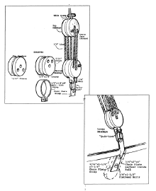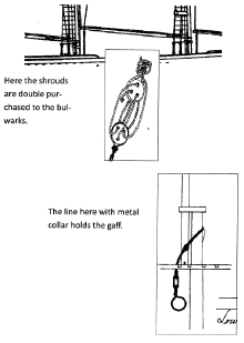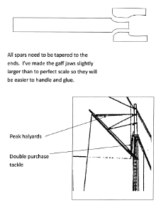The gaff has a few more parts. When Adventure was built, the peak halyard looped through five blocks so that it would be easier to pull the sail taut. After all, sails on a schooner are heavier than on a PD racer. With a model you can do the five blocks or one or two or any number. The gaff was raised by a double purchase tackle, which was two blocks close together to provide an assist to the men on deck. The blocks are close to the gaff neck, through an eye on a metal band which was slid over the gaff about 2 or 3 feet from the gaff jaws.