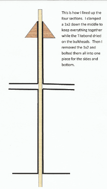I'm going to recommend putting the bulkheads on, fore and aft, of all four sections. Then I think you should clamp all four sections together. This will tell you how tight the four sections come together. This will also help you keep everything at right angles when you put the side pieces and bottom pieces on. I will recommend putting on the reinforcement stringers, drill the holes through and bolt it or clamp it before you put the sides and bottom on. This way you'll find out how square the sections are before it's too late.