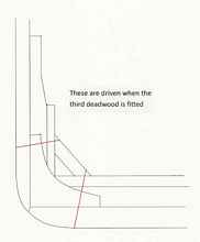 The amount of overhand depended on the length of the ship, 1/4 inch for every foot of waterline. The counter timber leg was 50 degrees to the horizon. The width of the wing transom piece itself could be 2/3 of an inch for every foot of keel length on smaller schooners, but this was not the rule for the great warships. That would make the wing transom on a ship of the line huge. On some ships the wing transom was bolted to the stenpost and the fashion piece, but on most the wing transom is received into a rabbet on the inside of the sternpost.