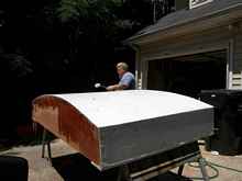 After that I changed my design to include 8 inch wide decks, so that they will keep water out of the boat in the case of a capsize. I've tested this several times, and it works very well. Even though the boat is open under the decks, they float the Duck high enough that one can right the boat with no extra water inside.
