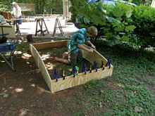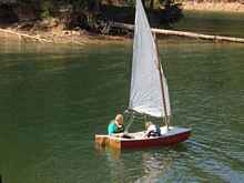 The design we used for they Troop boats was full length side airboxes, a small front deck, and Bolger LOM sails made from Tyvek. We used bamboo for masts and yards, and carved foils from 1x4 pine.