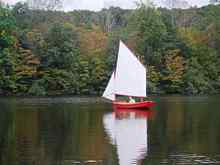The first boat I took out this summer was the Slam Dink. There is rumor that there was another one built somewhere, but all I know about is this one. It has a traditional double sprit rig. Both a sprit boom and sprit yard which are tied off close together making it easy to adjust the tension. My brother, Sean, (along with Lauren, his cousin) built this boat when he was a kid. It was his first boat build. I took charge of it since I have more room and both my father and he have moved on to other boats. I find this the perfect boat to take young kids out in. It doesn’t have flotation but it is made of wood and will float. In shallow water you can have a kid get out there and really learn how his weight works with the boat. I went to a Memorial Day party and there where about 12 little boys there. For some reason all my friends had boys, and it seems that my daughter is one of the few girls. She will be very popular at future Memorial Day parties.
