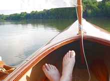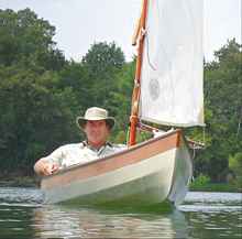 Since this writing, I splashed the Bufflehead. Here is a shot from her maiden sail; the wind was so light that I left the boom stowed and went loose footed (no pun). What a great design and source of joy.