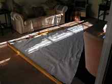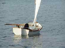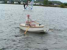 Family, commitments and holidays conspired to delay the first sail, to the point I thought that the cold weather would intervene, but no, the moderately warm days still keep coming and no sign of the fall yet. In building the dinghy I found that Joe Dobler had done a good job of the design and implementation of the hull and the plans. The only problem I had was in fitting the gunwale, but I suspect that was because I used white oak laminated up to 1.5", not something you would bend easily. Fitting the rigging was a different proposition. I chose the Gunter rig option as the spars were shorter and easier to stow, a very valid option, and well worth the slight extra complexity in rigging and fittings. The spars were easy to make and varnish, the mast took more time to shape and smooth ready for its coat of fibreglass and paint. The boom jaws in white oak and Gunter jaws in aluminium took time to shape and fit but were a relatively simple task, the only job left was the sail and running rigging. For the sail I chose some heavy duty cloth that my father saved from a skip some 40 years ago, when he worked as a shop fitter. I think it is nylon as it has more stretch than would be ideal, but as it was free and this was a dinghy on a budget it was worth a try. My mothers old Pinnock sewing machine was more heavy duty and solidly built than ours, it worked a treat and soon the sail was built to specifications with one foot shatter proof plastic rulers for the battens.
