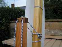 At the bottom of the mast a turning block and cleat to fasten off the halyard at each side of the mast. To the fore of the mast is a further cleat to tie off the topping lift. The photos describe the system far more eloquently than I ever could.