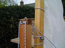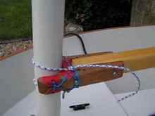 - Splicing 6mm multiplat is next to impossible, so I sewed and whipped the joints, I allowed too much overlap and this interferes with the mainsheet pullies.
