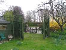 Access is difficult from a narrow lane, fortunately the church car park is opposite so I lined up the gates with this and made the doors 12' width to allow for backing the trailer into the garden.