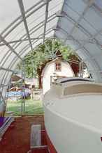 Marquee, again sounds good, and many cheap marquees are available for about £400, the trouble is that they are not so secure from what I have seen. To get a good one with a decent resale price I would need to pay about £800 and then you have a structure designed to be fixed to the ground for use by humans 6’ high, not an extra height boat on a trailer. To adjust the structure to fit on top of a wooden edging is more expensive still.
