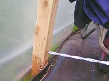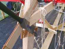 The first job is to cut the frames to take the chines, bear in mind you will probably have to make small adjustments to get the actual finished fit so allow for this. You will need two good anchor points for the windlasses approximately at right angles to the finished position of the front end of the chines. I used vine eyes in the uprights of the boat shed near the ground to get the correct angle.
